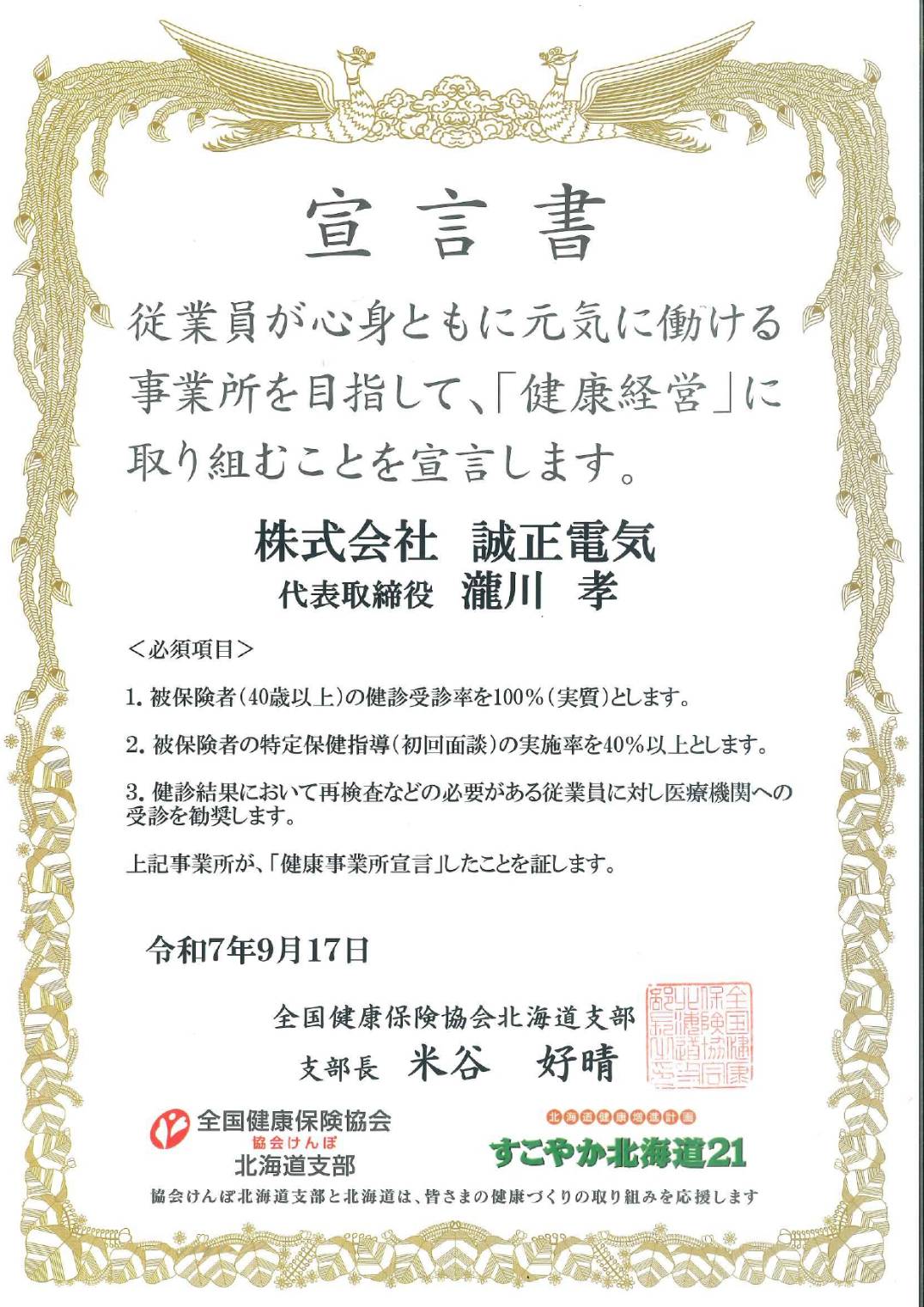 株式会社誠正電気は、従業員一人ひとりが心身ともに健康でいきいきと働ける環境を実現するため、「健康経営」を推進してまいります。